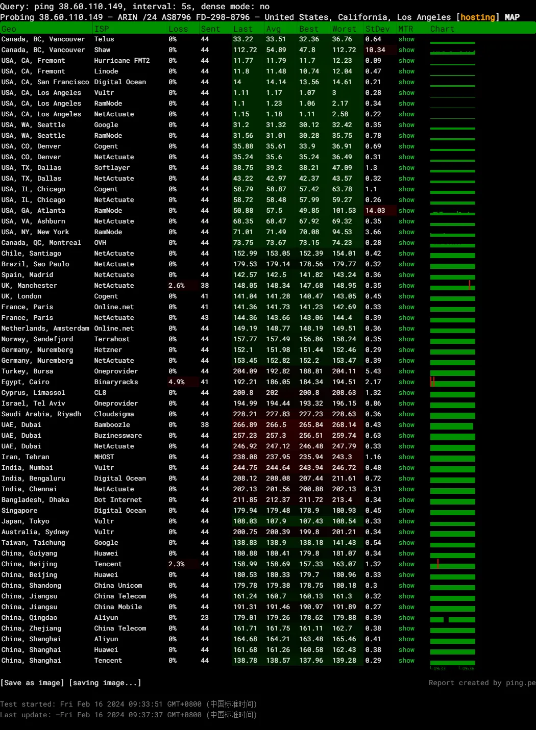 traceroute to 101.4.117.213 (101.4.117.213), 30 hops max, 32 byte packets1 38.60.110.1 17.43 ms AS8796 美国, 加利福尼亚州, 洛杉矶, cogentco.com2 *3 192.168.226.22 0.71 ms * 局域网4 219.158.42.41 177.37 ms AS4837 美国, 加利福尼亚州, 洛杉矶, chinaunicom.com, 联通5 219.158.97.209 160.28 ms AS4837 中国, 广东, 广州, chinaunicom.com, 联通6 219.158.4.77 160.65 ms AS4837 中国, 广东, 广州, chinaunicom.com, 联通7 219.158.3.9 160.59 ms AS4837 中国, 广东, 广州, chinaunicom.com, 联通8 219.158.107.29 164.76 ms AS4837 中国, 上海, chinaunicom.com, 联通9 219.158.119.250 167.64 ms AS4837 中国, 上海, chinaunicom.com, 联通10 *11 *12 *13 *14 *15 *16 *17 *18 *19 *20 *21 *22 *23 *24 *25 *26 *27 *28 *29 *30 *
